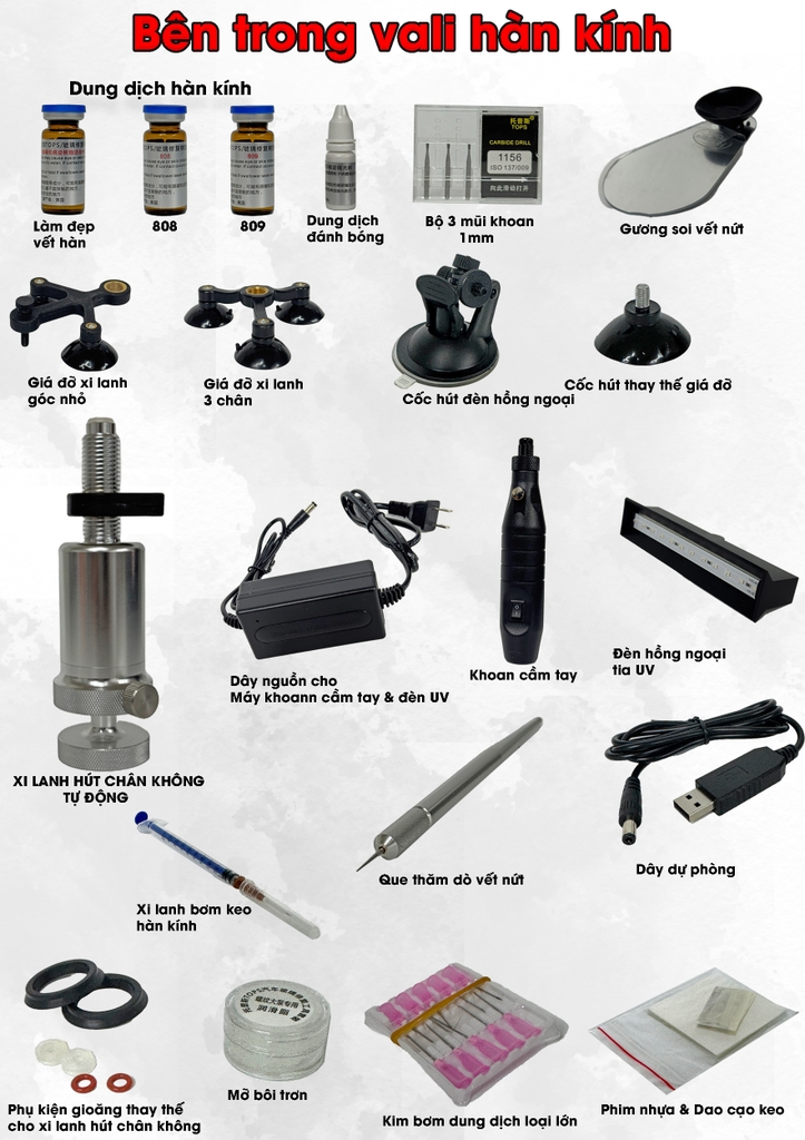 Vali chuyên dụng với đầy đủ dụng cụ và dung dịch hàn kính.