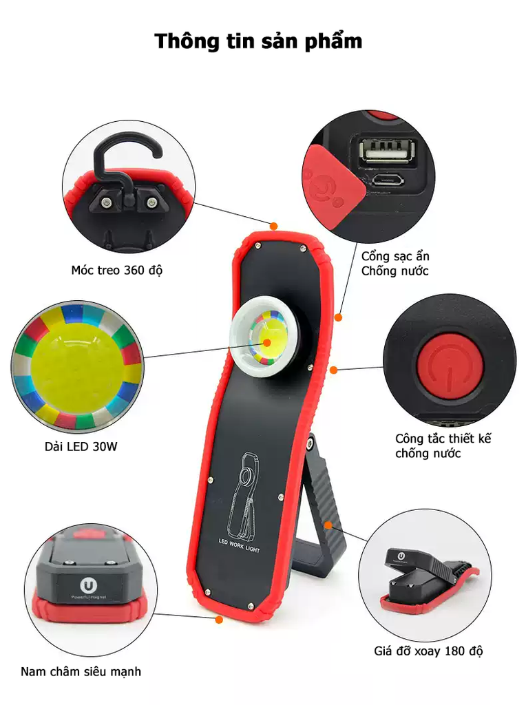 – Đây là đèn LED đa năng với thiết kế cầm tay, bên trong chân đế là nam châm hút siêu mạnh giúp sản phẩm trở nên linh hoạt khi có thể gắn nó ở bất cứ đâu có kim loại, nó cũng có móc treo cố định